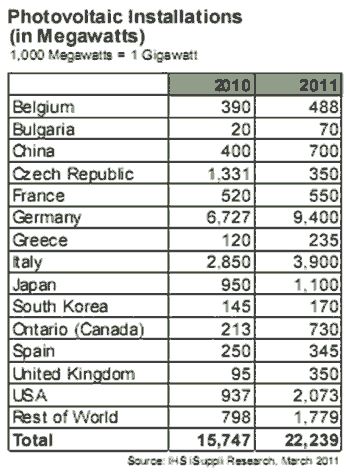 相比之下,IHS iSuppli公司的研究顯示,全球第三大太陽能市場(chǎng)美國,預(yù)計(jì)2011年P(guān)V安裝容量為2.1GW。