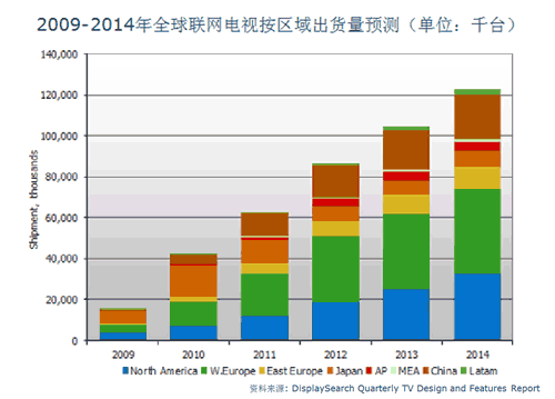 在新興市場,2010年東歐地區(qū)出貨量為250萬,2014年預計將超過1000萬臺;2013年中國平板電視中將有33%具備聯(lián)網功能。