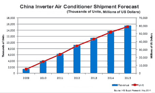 去年中國(guó)市場(chǎng)空調(diào)變頻器出貨量為1480萬(wàn)個(gè),2009年是510萬(wàn)個(gè)。預(yù)計(jì)2015年末出貨量將接近6000萬(wàn)大關(guān),期間的復(fù)合年度增長(zhǎng)率高達(dá)31.8%。變頻器銷(xiāo)售額同樣也會(huì)大幅增長(zhǎng),到2015年將從2010年的40億美元增至155億美元,
