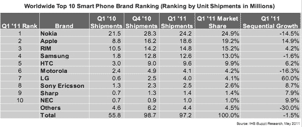 2011年第一季度蘋果排名第二,iPhone出貨量為1860萬(wàn)部,比2010年第四季度的1620萬(wàn)部增長(zhǎng)14.9%。在全球五大智能手機(jī)廠商中,蘋果的出貨量增長(zhǎng)幅度最高。第五大智能手機(jī)廠商HTC增長(zhǎng)6.2%,為第二高增長(zhǎng)率,與蘋果相差甚遠(yuǎn)。第一季度整體智能手機(jī)市場(chǎng)出貨量環(huán)比下降1.5%,彰顯蘋果業(yè)績(jī)不俗。