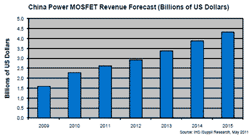 2010-2015年中國功率MOSFET市場的總體復合年度增長率將為13.7%。查詢進一步信息,請訪問http://www.isuppli.com/China-Electronics-Supply-Chain/Pages/Products.aspx