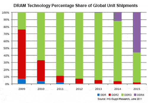以前的主流技術(shù)DDR2統(tǒng)治DRAM市場(chǎng)的時(shí)間是四年左右,DDR3將主導(dǎo)該市場(chǎng)五年,從2010年開(kāi)始,直到2014年預(yù)計(jì)失去主流地位。IHS iSuppli公司的研究顯示,2015年DRAM模組的主流密度將從2009年的1GB增加到8GB。