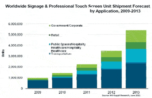 【產(chǎn)通社,6月28日訊】盡管面向標牌、教育和專業(yè)應(yīng)用的互動式顯示技術(shù)已經(jīng)出現(xiàn)了許多年,但推動該市場快速增長所需創(chuàng)新性產(chǎn)品現(xiàn)在才開始上市,比如過去一年推出的觸摸屏產(chǎn)品與解決方案。預(yù)計2013年各類用于標牌、教育和專業(yè)應(yīng)用的觸摸屏顯示器的全球出貨量將達到540萬個,而2010年是140萬個。這些顯示器包括液晶、等離子、正面投影和背投。2009-2013年該市場的復(fù)合年度增長率將高達56%。