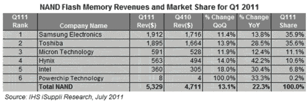 【產(chǎn)通社,7月5日訊】據(jù)IHS iSuppli公司的研究,2011年第一季度NAND閃存領(lǐng)域爭奪頭號排名的競爭加劇,排名第二的東芝接近與三星電子平起平坐。長期以來,三星一直是最大的NAND閃存廠商。
