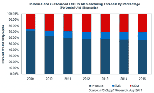 【產(chǎn)通社,7月21日訊】據(jù)IHS iSuppli公司的EMS/ODM研究,由于價格下滑和利潤率下降迫使許多品牌廠商外包制造業(yè)務(wù),2010-2015年全球液晶電視外包生產(chǎn)業(yè)務(wù)預(yù)計增長近一倍。外包電子業(yè)務(wù)的兩大組成部分——電子制造服務(wù)(EMS)提供商與原始設(shè)計制造(ODM)公司,預(yù)計2015年合計生產(chǎn)1.279億臺液晶電視,而2010年是6510萬臺。2015年,EMS與ODM將占液晶電視產(chǎn)量的43.0%,高于2010年的36.2%。