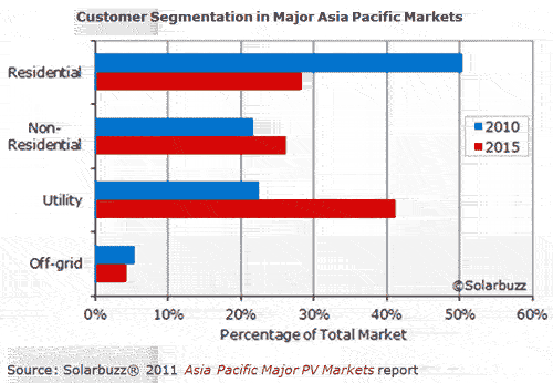 Solarbuzz表示,亞太各主要市場(chǎng)的政策結(jié)構(gòu)都正在發(fā)生著深刻的轉(zhuǎn)變。其中,中國(guó)、印度和澳大利亞開(kāi)始建設(shè)并網(wǎng)光伏發(fā)電市場(chǎng),日韓則面臨著政策變遷,以期在未來(lái)幾年重新刺激國(guó)內(nèi)需求。2011年中國(guó)光伏市場(chǎng)規(guī)模最多可較上年擴(kuò)張達(dá)174%,這得益于國(guó)家和各省的建設(shè)規(guī)劃。中國(guó)是光伏產(chǎn)品生產(chǎn)大國(guó),產(chǎn)量約占全球一半之多,但國(guó)內(nèi)光伏發(fā)電市場(chǎng)仍處于起步階段。