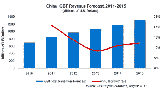 【產(chǎn)通社,8月10日訊】據(jù)IHS iSuppli公司中國(guó)研究服務(wù)即將發(fā)表的一份報(bào)告,由于綠色能源與能源效率得到更多的重視,以及政府投資支持和嚴(yán)格的能源政策,2011-2015年中國(guó)絕緣柵雙極型晶體管(IGBT)市場(chǎng)銷售額的復(fù)合年度增長(zhǎng)率將達(dá)13%。