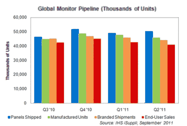 【產(chǎn)通社,9月6日訊】對于臺式電腦液晶顯示器產(chǎn)業(yè)中的許多企業(yè)來說,從2011年初開始,現(xiàn)實一直離期望很遠。媒體平板銷量快速增長,而經(jīng)濟成長速度放慢,導致2011年整體監(jiān)視器市場增長緩慢。因此,IHS公司把2011年全年監(jiān)視器出貨量增長率預(yù)估從2.5%降到了1.5%。