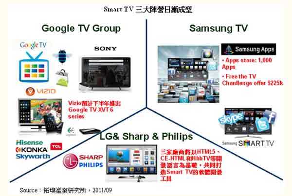 社交網(wǎng)絡(luò)導(dǎo)向的Smart TV產(chǎn)品誕生之后,操作系統(tǒng)平臺(tái)將驅(qū)動(dòng)Smart TV陣營(yíng)成形,陣營(yíng)內(nèi)各自共享平臺(tái)上的應(yīng)用程序內(nèi)容。以目前趨勢(shì)來看,拓墣表示目前擁有近千個(gè)應(yīng)用程序以及1,000萬次下載量的Samsung Smart TV,將自成一大陣營(yíng);Sony、Vizio,以及中國(guó)大陸彩電品牌海信、TCL與康佳將加入Google Android平臺(tái);LG、Sharp、Philips三家廠商則以HTML5、CE-HTML和HbbTV等開發(fā)語言為基礎(chǔ),共同打造Smart TV的軟件開發(fā)工具。TV品牌業(yè)者除了將研發(fā)能量集中開發(fā)應(yīng)用程序之外,影音內(nèi)容質(zhì)量則是另一決勝關(guān)鍵。