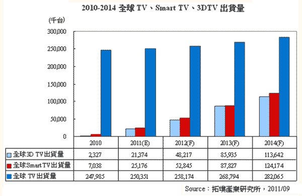 【產(chǎn)通社,10月3日訊】拓墣科技(Topology Technology)官網(wǎng)消息,Smart TV雖仍處于起步階段,但2011至2012年的出貨量成長(zhǎng)數(shù)字預(yù)計(jì)將十分驚人,而2011年由智慧行動(dòng)終端所掀起的科技產(chǎn)業(yè)典范轉(zhuǎn)移,終究有一天亦將蔓延到TV。根據(jù)拓墣產(chǎn)業(yè)研究所預(yù)測(cè)顯示,全球Smart TV出貨量將有機(jī)會(huì)從2010年的704萬臺(tái)成長(zhǎng)到2011年的2,518萬臺(tái),占整體TV比重的10.4%;隨著更多TV品牌業(yè)者推出新款Smart TV,2012年全球Smart TV出貨量可望增加至5,285萬臺(tái),年成長(zhǎng)逾100%,占整體TV比重20%。
