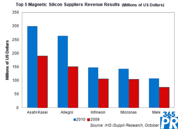 【產(chǎn)通社,10月13日訊】據(jù)IHS iSuppli公司的MEMS與傳感器專題報(bào)告,五大硅磁傳感器供應(yīng)商占全球總體市場的80%以上。這類傳感器廣泛用于汽車應(yīng)用,以及智能手機(jī)和平板電腦的數(shù)字羅盤之中,如蘋果公司的iPhone和iPad。2010年五大硅磁傳感器供應(yīng)商的合計(jì)營業(yè)收入高達(dá)9.62億美元,在11.8億美元的整體市場中占82%。這五大供應(yīng)商是日本Asahi Kasei Microsystems、美國Allegro Microsystems、德國英飛凌、瑞士Micronas和比利時(shí)Melexis N.V.。