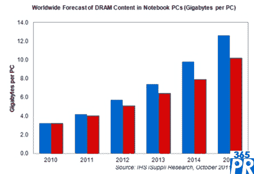 IHS公司認(rèn)為,前幾年P(guān)C DRAM以40%速度增長(zhǎng)的時(shí)期顯然已經(jīng)成為過(guò)去。DRAM廠商知道這點(diǎn),現(xiàn)在把注意力轉(zhuǎn)向提高移動(dòng)DRAM產(chǎn)量,面向智能手機(jī)和平板電腦等產(chǎn)品,這些產(chǎn)品可能為DRAM提供下一波增長(zhǎng)機(jī)會(huì)。例如,今年平板電腦的DRAM容量將大增近120%,從去年的274MB上升到598MB。