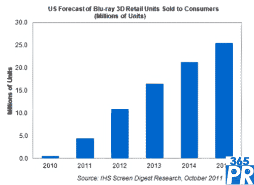 預(yù)計(jì)2011年通過零售渠道銷售給美國消費(fèi)者的BD3D影片數(shù)量將接近450萬個(gè),而2010年BD3D剛剛出現(xiàn)的時(shí)候,銷量只有50萬個(gè)。對(duì)于這種高清3D格式來說,前景仍然非常光明,預(yù)計(jì)2012年零售銷量將增長一倍以上。未來幾年將保持兩位數(shù)的增長率,2015年銷量將超過2500萬個(gè)。雖然未來BD3D占總體藍(lán)光銷量的比例仍會(huì)相對(duì)較小,但未來五年將快速增長。