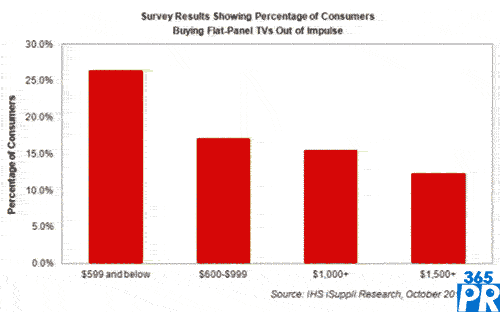 【產(chǎn)通社,11月2日訊】據(jù)IHS iSuppli公司的美國(guó)電視消費(fèi)者偏好分析報(bào)告,599美元的價(jià)格顯然夠低,足以刺激超過(guò)四分之一的美國(guó)電視買家僅出于一時(shí)沖動(dòng)就購(gòu)買一臺(tái)平板電視。第三季度,對(duì)于599美元以下的電視,沖動(dòng)型購(gòu)買占26.5%,比去年同期的23%有明顯上升。IHS公司認(rèn)為,這可以歸因于頗具吸引力的“拿一臺(tái)就走”的價(jià)格,消費(fèi)者購(gòu)買時(shí)無(wú)需多想。