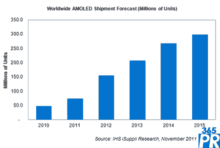 2011年全球AMOLED出貨量預(yù)計(jì)將達(dá)到7370萬個(gè),比去年的4740萬個(gè)大增55%。明年增長勢頭將更加強(qiáng)勁,預(yù)計(jì)增長110%,隨后將以兩位數(shù)的速度增長,直到2015年。到2015年,AMOLED出貨量將達(dá)到2.973億個(gè)左右,是2010年的六倍以上。