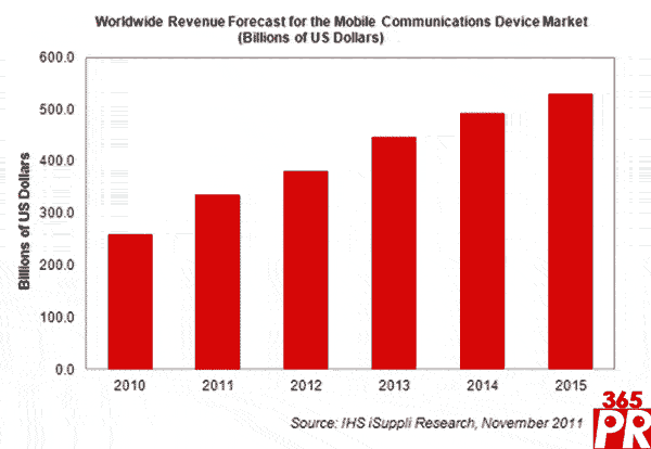 【產(chǎn)通社,11月17日訊】據(jù)IHS iSuppli公司的無線通信市場研究報告,智能手機(jī)和平板電腦在消費者中日益普及,今年將推動移動通信產(chǎn)品與無線基礎(chǔ)設(shè)施設(shè)備營業(yè)收入大增29%。預(yù)計2011年總體移動通信設(shè)備市場營業(yè)收入將達(dá)到3356億美元,高于2010年的2599億美元。今年的增長率將超過2010年的19%,亦將至少是2015年前這幾年的最高增長率。預(yù)計2015年營業(yè)收入將突破5000億美元。