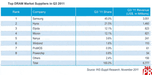2012年其它廠商的市場(chǎng)份額可能不會(huì)大幅上升,一家廠商的退出——或者通過(guò)破產(chǎn),或者通過(guò)合并——很可能是有望重塑DRAM產(chǎn)業(yè)格局的唯一因素。查詢進(jìn)一步信息,請(qǐng)?jiān)L問(wèn)官方網(wǎng)站http://www.isuppli.com。
