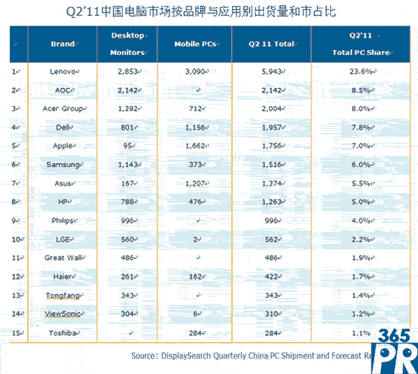 聯(lián)想將液晶顯示器、臺(tái)式機(jī)和移動(dòng)電腦的市場(chǎng)總份額提高到了全國(guó)電腦市場(chǎng)的23.6%,進(jìn)而鞏固了其在中國(guó)電腦市場(chǎng)的領(lǐng)先地位;冠捷的市場(chǎng)占比為8.5%。2011年第二季聯(lián)想和冠捷的市場(chǎng)總占有率達(dá)到32.1%,第一季度為27.6%;此外,第二季聯(lián)想在各個(gè)細(xì)分市場(chǎng)的占有率均有提高。