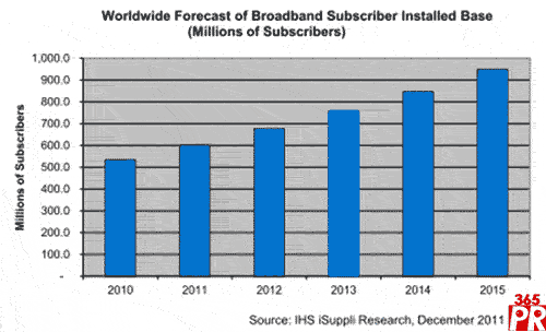 【產通社,12月15日訊】由于對互聯網接入的需求不斷增長,尤其是來自中國等發(fā)展中地區(qū)的需求,未來幾年全球寬帶用戶預計增長75%以上,2010-2015年新增用戶將達到4.15億個。據IHS iSuppli公司的寬帶與數字連接家庭市場追蹤報告,到2015年,全球寬帶用戶將達到9.486億個,而2010年是5.333億個。今年寬帶用戶將達到6.002億個,比2010年增長12.5%。