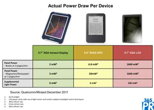 電子書閱讀器長期使用名為EPD的電子紙,而美國高通推出了Mirasol彩色顯示技術。高通與韓國最大圖書銷售商聯(lián)合開發(fā)的非英語閱讀器Kyobo采用了這種彩色技術。采用Mirasol顯示器的Kyobo閱讀器具有一塊5.6英寸的1024X768像素顯示器,像素密度為225ppi。Mirasol具備EPD的典型特點,如寬視角并能在陽光下閱讀。高通技術的獨特之處是能夠顯示全彩色和提供快速響應速度,而且沒有損害傳統(tǒng)單色閱讀器的低功耗優(yōu)點。如果每天利用其閱讀30分鐘,50%的時間開啟前燈(front light)并關閉無線功能,Kyobo閱讀器充一次電可以使用數(shù)周。