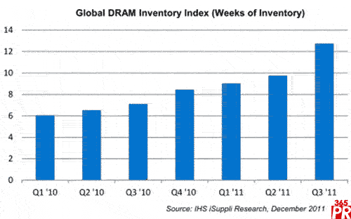 【產(chǎn)通社,12月22日訊】據(jù)IHS iSuppli公司的DRAM市場簡報,需求增長乏力和增長前景黯淡,已在困擾DRAM產(chǎn)業(yè),如今又面臨庫存急劇上升的問題。庫存勁增可能導(dǎo)致DRAM產(chǎn)業(yè)繼續(xù)下滑。