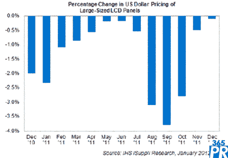 【產(chǎn)通社,2月1日訊】據(jù)IHS iSuppli公司的液晶價(jià)格追蹤報(bào)告,大尺寸液晶顯示器(LCD)面板價(jià)格在2011年12月持穩(wěn),結(jié)束了此前連續(xù)五個(gè)月下降的趨勢(shì)。由于銷售情況好于預(yù)期,且液晶工廠降低生產(chǎn)率,整體面板市場(chǎng)形勢(shì)得到改善。
