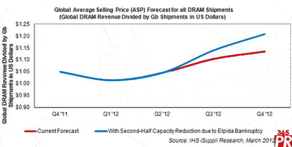 如果爾必達(dá)的產(chǎn)能減少逾25%,則到2012年底,所有DRAM出貨量的全球平均銷售價(jià)格(ASP)預(yù)計(jì)上升到1.21美元,比上半年末的1.05美元上漲15.5%。如果不是破產(chǎn)導(dǎo)致產(chǎn)能大減,今年底價(jià)格將上升到1.13美元,只比上半年末的水平高出8.5%。