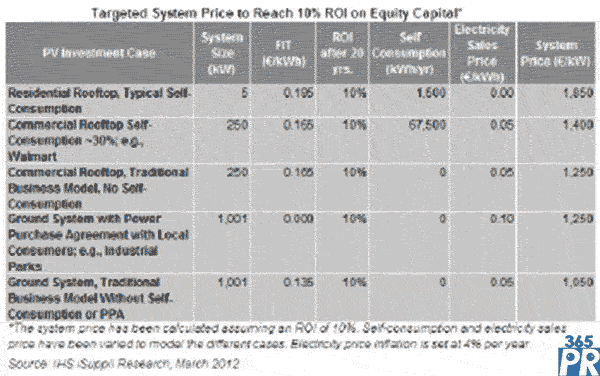 在FIT調(diào)整之后,IHS iSuppli公司的計(jì)算結(jié)果顯示,如果系統(tǒng)價(jià)格為1850歐元/kW,即使取消自我消費(fèi)獎(jiǎng)勵(lì),德國(guó)住宅系統(tǒng)仍能達(dá)到10%的股本(20%)投資回報(bào)率。由于德國(guó)市場(chǎng)的價(jià)格已經(jīng)降到這樣的水平,住宅領(lǐng)域?qū)⒗^續(xù)提供有吸引力的投資條件,盡管政府降低FIT。但是,對(duì)于最高達(dá)1000kW的大型屋頂系統(tǒng)來說,能否實(shí)現(xiàn)一定的投資回報(bào)將取決于本地能夠消費(fèi)多少所發(fā)電量,或者能夠通過購(gòu)電協(xié)議出售多少電量。以自己消費(fèi)大約30%所發(fā)電量的超市或者工廠為例,如果系統(tǒng)價(jià)格不高于1400歐元/kW,則太陽(yáng)能系統(tǒng)的投資回報(bào)率可以達(dá)到10%。但這種情形接近目前所能達(dá)到的極限水平。