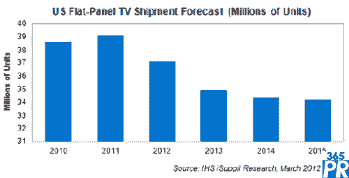 【產(chǎn)通社,3月28日訊】今年美國平板電視市場(chǎng)出貨量預(yù)計(jì)首次同比下降,結(jié)束自該市場(chǎng)開始啟動(dòng)以來的持續(xù)增長(zhǎng)局面,這可能是一個(gè)決定性的轉(zhuǎn)折點(diǎn)。據(jù)IHS iSuppli公司的美國電視市場(chǎng)追蹤報(bào)告,2012年美國市場(chǎng)的平板電視出貨量預(yù)計(jì)降到3710萬臺(tái),比2011年的3910萬臺(tái)減少5%。去年出貨量較2010年的3860萬臺(tái)微增1%。