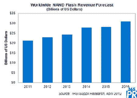 今年全球NAND閃存營業(yè)收入預(yù)計(jì)增長8%,從2011年的212億美元上升到229億美元。按照今年的營業(yè)收入預(yù)期,全球出貨量相當(dāng)于28823個(gè)1GB器件,而2011年是17401個(gè)。隨著智能手機(jī)、平板電腦和超級本固態(tài)硬盤(SSD)這三大市場使用的NAND閃存逐年增長,未來幾年NAND營業(yè)收入將持續(xù)攀升,到2016年預(yù)計(jì)達(dá)到309億美元左右。