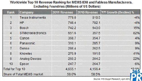 惠普去年排名再度淪為第二,MEMS營業(yè)收入為7.484億美元,與德州儀器一樣,也比2010年的7.821億美元減少4%;萜找恢痹谂c德州儀器競爭第一的位置,2005-2009年排名第一,但去年其用于噴墨打印頭的MEMS熱激勵器價格下滑;萜2005年亦開始從一次性打印頭轉(zhuǎn)向永久性打印頭,導(dǎo)致其一次性打印頭出貨量下滑。