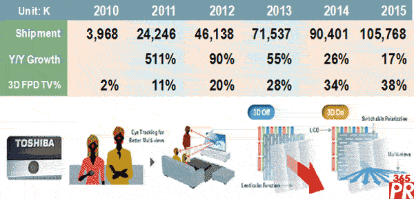 正當快門式與偏光式技術相互廝殺的同時,Toshiba已悄悄地發(fā)布裸眼式3D電視,將3D電視的技術競爭提升到另一個新的層次。Toshiba除了以12寸和20寸等級來試探市場外,還在2011 CES上展示56寸和65寸的裸眼式3D電視。