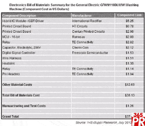 【產(chǎn)通社,7月11日訊】IHS iSuppli公司的拆解分析結(jié)果顯示,通用電氣洗衣機使用了相對較多的半導(dǎo)體,以降低能耗,這彰顯了消費電子產(chǎn)品領(lǐng)域增加使用電子元件的趨勢。