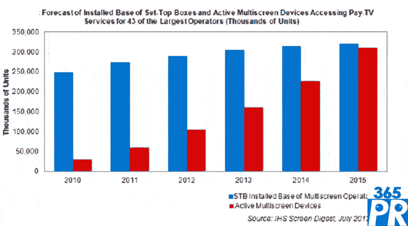 2015年,多屏運(yùn)營商的全球付費(fèi)電視機(jī)頂盒安裝基礎(chǔ)將達(dá)到3.217億個,比2011年的2.745億個增加17%。同時,經(jīng)常用于接收付費(fèi)電視服務(wù)的多屏設(shè)備將達(dá)到3.101億個,比2011年的6010萬個劇增400%。