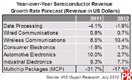 【產(chǎn)通社,7月23日訊】據(jù)IHS iSuppli公司全球半導(dǎo)體制造與供應(yīng)市場(chǎng)追蹤報(bào)告,2012年無(wú)線應(yīng)用將是全球半導(dǎo)體市場(chǎng)的救星。預(yù)計(jì)該應(yīng)用領(lǐng)域的半導(dǎo)體營(yíng)業(yè)收入將實(shí)現(xiàn)兩位數(shù)的增長(zhǎng),而其它六個(gè)主要半導(dǎo)體市場(chǎng)領(lǐng)域的增幅則小得多,甚至是負(fù)增長(zhǎng)。