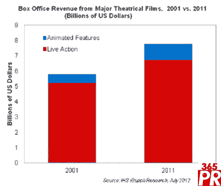 在美國電影市場,動畫片票房收入增幅最大,在2001-2011年大增89.5%,從5.597億美元上升到11億美元。相比之下,真人實(shí)景電影的年度票房收入同期僅增長28.5%,從52億美元上升到67億美元。這里所追蹤的電影的票房收入都必須超過5000萬美元,只有超過這個(gè)界線才被視為“大片”,并被納入研究樣本之中。