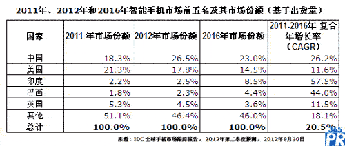 【產(chǎn)通社,9月1日訊】根據(jù)IDC《全球手機(jī)市場季度跟蹤報告》,由于消費(fèi)者對于低價智能手機(jī)的需求十分強(qiáng)勁,中國將在今年成為全球最大的智能手機(jī)市場,同時還將超越美國成為全球智能手機(jī)出貨量第一的國家級市場。數(shù)據(jù)顯示,2012年中國的智能手機(jī)出貨量將占到全球總出貨量的26.5%,而美國的份額則為17.8%。