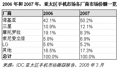 其中,諾基亞幾乎在該地區(qū)所有國家的市場中都處于統(tǒng)治地位。其在亞太區(qū)(不含日本)的市場份額由2006年的42%增長到2007年的超過50%。