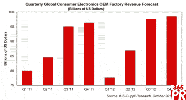【產(chǎn)通社,11月1日訊】在全球經(jīng)濟(jì)形勢(shì)低迷的情況下,由于品牌廠商在假日銷售季專注于低價(jià)策略以吸引買家,預(yù)計(jì)2012年全球消費(fèi)電子市場(chǎng)營業(yè)收入僅增長1.3%。據(jù)IHS iSuppli公司的家庭與消費(fèi)電子服務(wù),今年全球消費(fèi)電子原始設(shè)備制造商(OEM)工廠營業(yè)收入將從2011年的3560億美元增長到3610億美元。今年第四季度營業(yè)收入預(yù)計(jì)為990億美元,比2011年同期的960億美元增長2.2%。第四季度包含從黑色星期五開始的假日銷售旺季。
