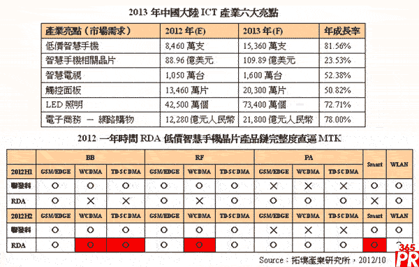 面對大陸手機(jī)產(chǎn)業(yè)的“高規(guī)格、低價(jià)格”趨勢,當(dāng)?shù)氐氖謾C(jī)芯片業(yè)者也抓緊機(jī)遇,急起直追。拓墣分析,以銳迪科(RDA)的積極表現(xiàn),2012年3月宣布收購基頻公司Coolsand,如虎添翼,由于高集成度和低成本是RDA的兩大殺手,而RDA還擁有其他手機(jī)主芯片廠商所缺乏的PA產(chǎn)品線,在2013下半年RDA即將進(jìn)入低階3G智慧機(jī)市場的態(tài)勢下,無疑說明了手機(jī)芯片市場的新戰(zhàn)局即將開打。