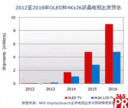 NPD DisplaySearch調整了對OLED電視的短期預測,預計2012年其出貨量僅為500臺,2013年為5萬臺,2016年通過大批量生產有望增長至900萬臺。2012年4Kx2K LCD電視出貨量為4千逾臺,預估2013年將增至15萬4千臺,2016年約5百萬臺,增長大多發(fā)生在50吋及更大尺寸。查詢進一步信息,請訪問官方網站http://www.displaysearch.com.cn。