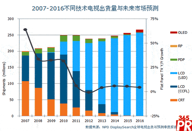 從長遠來看,由于電視汰換周期從一開始用平板替代CRT,轉換到平板升級,特別是新功能開發(fā)技術與流程日益成熟,成本持續(xù)降低,售價逐漸被消費者接受,如此一來將有助于恢復增長。我們預計液晶電視出貨量將持續(xù)增長,而對CRT和等離子電視的需求將下降。