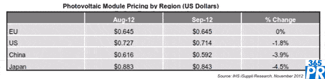 【產(chǎn)通社,11月7日訊】據(jù)IHS公司的太陽能光伏(PV)模組價(jià)格追蹤報(bào)告,9月光伏模組價(jià)格在全球所有地區(qū)都出現(xiàn)環(huán)比下降,只有歐盟因歐元兌美元升值而似乎未受影響。