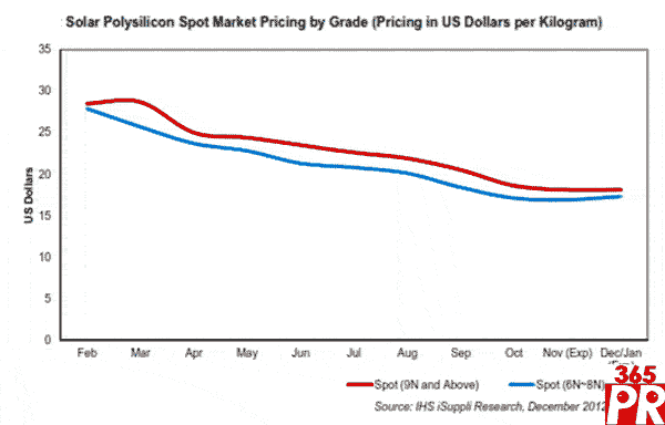 供應(yīng)商正在削減產(chǎn)量,渠道中的庫(kù)存繼續(xù)消耗,多數(shù)產(chǎn)業(yè)人士預(yù)計(jì)需求在2013年回升。因此,太陽(yáng)能多晶硅的現(xiàn)貨市場(chǎng)價(jià)格將在明年初小幅上升。即便如此,現(xiàn)貨價(jià)格仍將遠(yuǎn)低于合同市場(chǎng)的價(jià)格,這將促使太陽(yáng)能多晶硅供應(yīng)商繼續(xù)降低合同價(jià)格,向現(xiàn)貨市場(chǎng)看齊。總體來(lái)看,這預(yù)示供應(yīng)仍將超過(guò)需求,價(jià)格將在2013年稍晚的時(shí)候恢復(fù)下滑態(tài)勢(shì)。