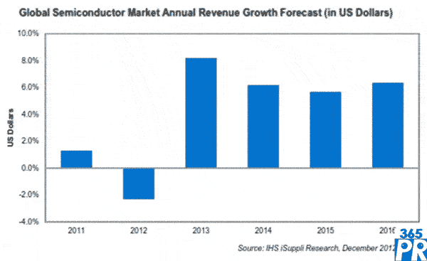 IHS公司一年前預(yù)測:“營業(yè)收入增長預(yù)計要等到2013年以后才會出現(xiàn)像樣的回升! IHS iSuppli AMFT預(yù)測,如果2013年全球GDP增長預(yù)測的小幅改善保持住,則2013年半導(dǎo)體營業(yè)收入有望增長8.2%。
