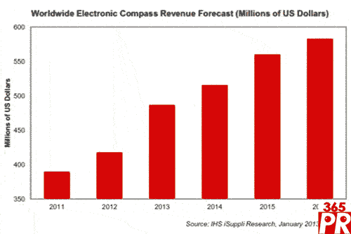 【產(chǎn)通社,1月22日訊】據(jù)IHS iSuppli公司的MEMS市場簡報,磁力計(即電子羅盤)越來越多地進入智能手機與平板電腦,用于實現(xiàn)導航與其它高級的動作驅(qū)動應用,將推動電子羅盤營業(yè)收入今年勁增16%。預計2013年磁力計營業(yè)收入將達到4.87億美元,高于去年的4.183億美元和2011年的3.901億美元。今年磁力計營業(yè)收入有望實現(xiàn)兩位數(shù)的增長,將是2012-2016年的最高增長率,其它三年預計平均增長4-9%。