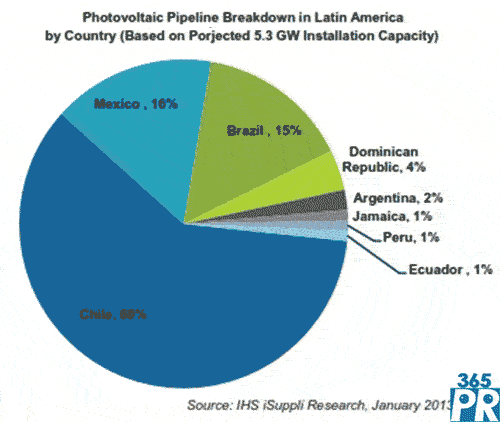 【產(chǎn)通社,1月22日訊】據(jù)IHS公司太陽能光伏市場展望報(bào)告,受一些增長因素的推動,拉美未來幾年將成為重要的光伏市場,可能讓該地區(qū)由嚴(yán)重依賴原油轉(zhuǎn)向可再生的太陽能。在拉美地區(qū)的八個(gè)重要市場,2012-2016年總體安裝容量預(yù)計(jì)為5.3GW,智利將占其中的60%。墨西哥規(guī)模排名第二,預(yù)計(jì)占16%,其次是巴西占15%。該地區(qū)光伏發(fā)展比較突出的其它國家包括多米尼加共和國、阿根廷、牙買加、厄瓜多爾和秘魯。