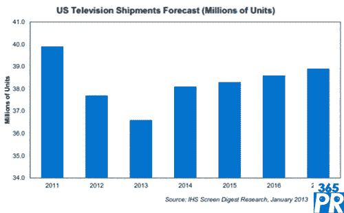 OLED與UHD電視在美國市場推出,適逢該國電視出貨量下降,以及平均銷售價(jià)格不斷下滑,這兩個(gè)因素削弱了電視廠商的總體營業(yè)收入。去年美國電視市場的電視出貨量從2011年的3990萬臺下降至3770萬臺,減少6%。今年的前景似乎也不太好,預(yù)計(jì)下降至3660萬臺,隨后在2014年回升至3810萬臺。到2017年,美國電視出貨量將達(dá)到3890萬臺左右。