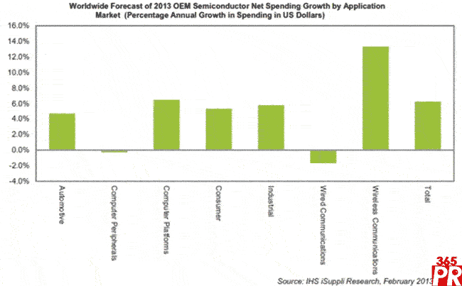 【產(chǎn)通社,2月28日訊】無(wú)線領(lǐng)域2013年將是引領(lǐng)原始設(shè)備制造商(OEM)半導(dǎo)體支出增長(zhǎng)的主要領(lǐng)域,預(yù)計(jì)該領(lǐng)域的半導(dǎo)體支出將實(shí)現(xiàn)兩位數(shù)的增長(zhǎng),以支持智能手機(jī)、媒體平板和移動(dòng)基礎(chǔ)設(shè)施設(shè)備等市場(chǎng)的快速增長(zhǎng)。