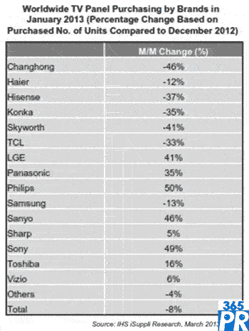 與中國(guó)買家形成明顯對(duì)比的是,中國(guó)以外的國(guó)際電視品牌卻在1月份增加了面板訂單。這些國(guó)際品牌在2012年12月大幅減少了電視面板購(gòu)買量。